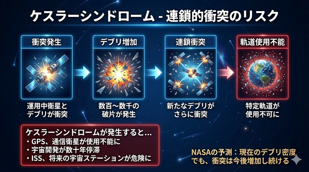 もう一つの深刻な問題がスペースデブリです。地球軌道上には36,000個以上の追跡可能なデブリが存在し、その数は増え続けています。最悪のシナリオでは、ケスラーシンドローム——デブリの連鎖的衝突——により、特定の軌道が使用不能になる可能性があります。