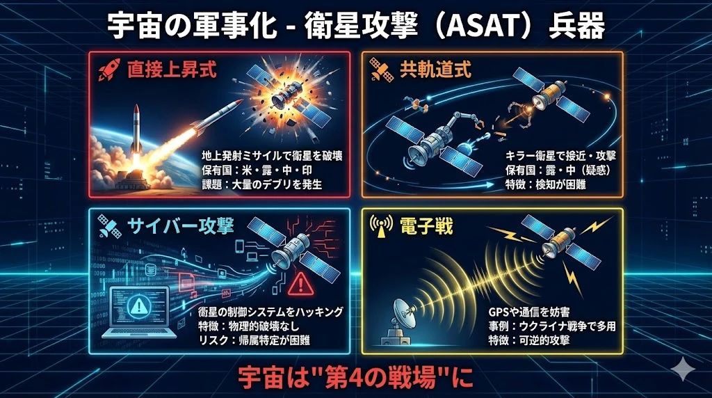 ASAT(Anti-Satellite)兵器は、敵国の衛星を無力化・破壊する兵器です。
