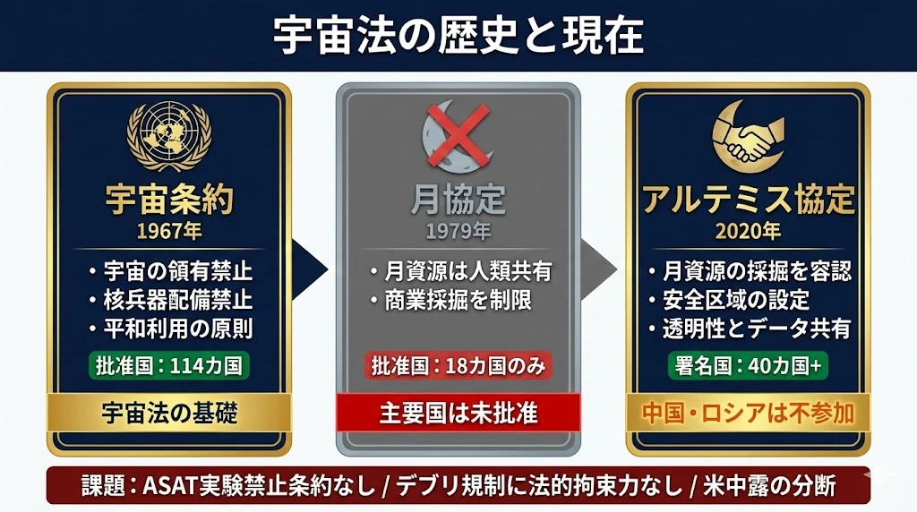| 月協定 | 1979年 | 月資源は人類共有財産 | 主要国は未批准 |