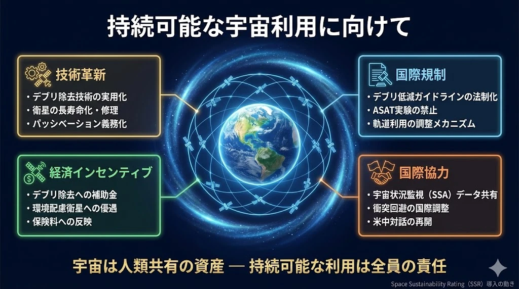 | 国際規制 | ガイドラインの法制化、ASAT実験禁止 |
